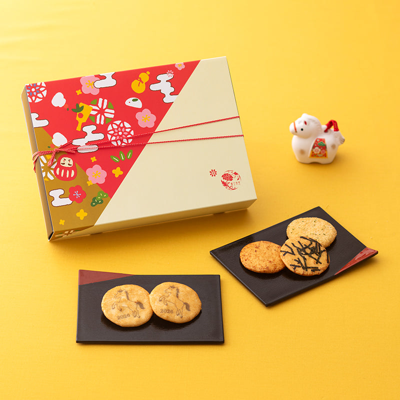 2026年の干支「午」を描いたシンプルな 醤油せんべいと、きざみ海苔、小丸揚げ焼き塩、かつお七味の富土見堂定番の味4種を詰め合わせしました。華や かなお正月柄のパッケージは年始のご挨拶としておすすめです。